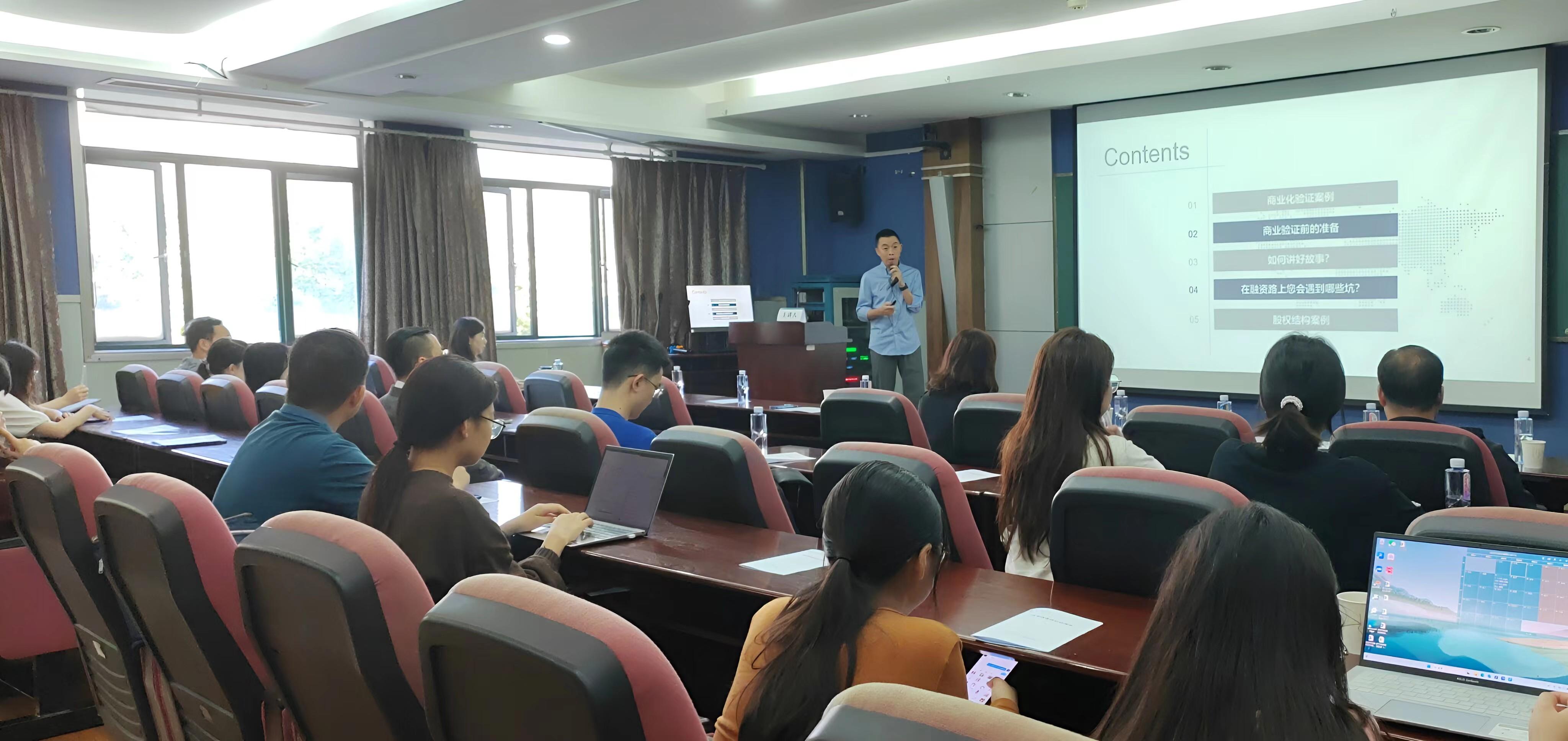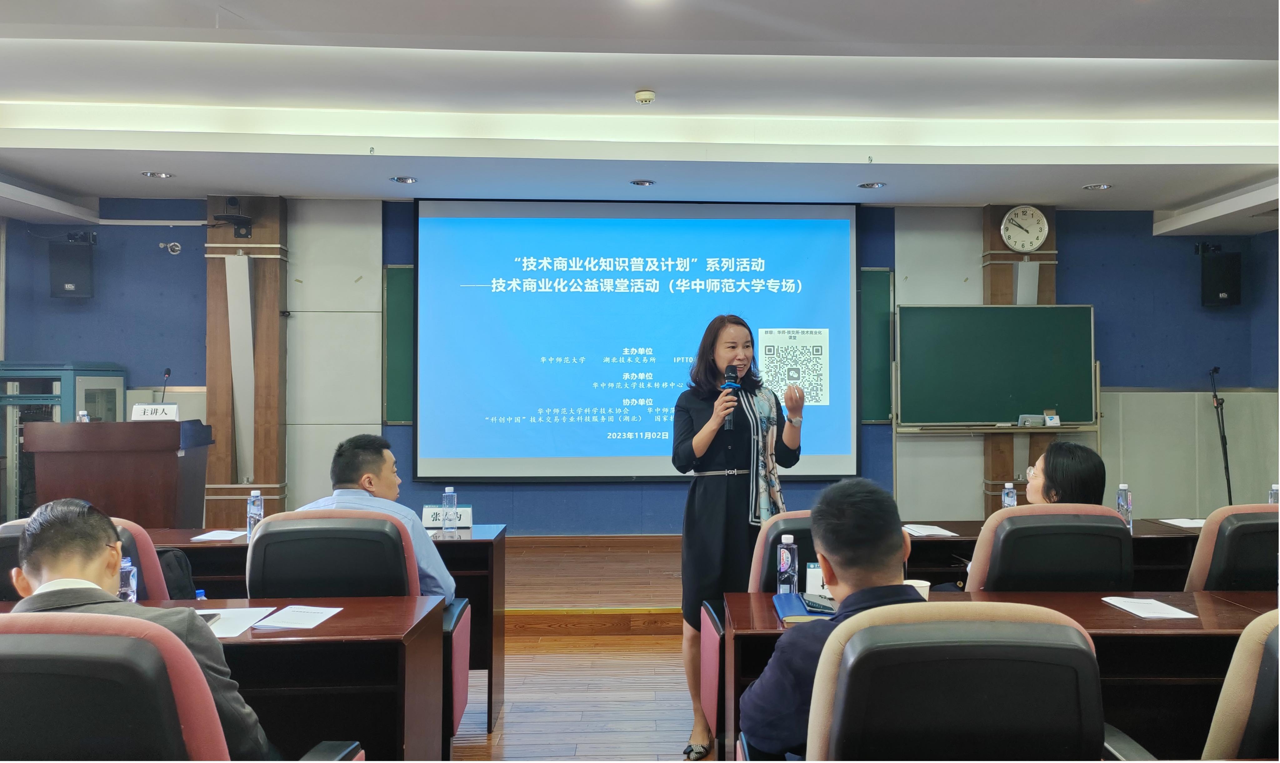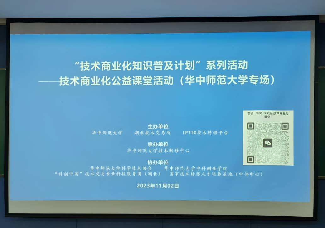2023年11月2日上午9时,“技术商业化知识普及计划”系列活动——技术商业化公益课堂活动(华中师范大学专场)在华中师范大学理科楼9409报告厅顺利举办。中科创业学院创业导师、上海纵创科技有限公司(纵创资本)总经理、CPA张大为应邀带来《科技成果转化项目的商业化验证与落地策划》分享,中科创业学院创业导师、恒慧知识产权创始人、上海市专利转化专项计划专利运营特派员张宁展应邀带来《立足供需特点开展高价值专利培育与转化》分享,我校技术转移中心及中科创业学院博雅班老师、同学等三十余人参加了此次活动。