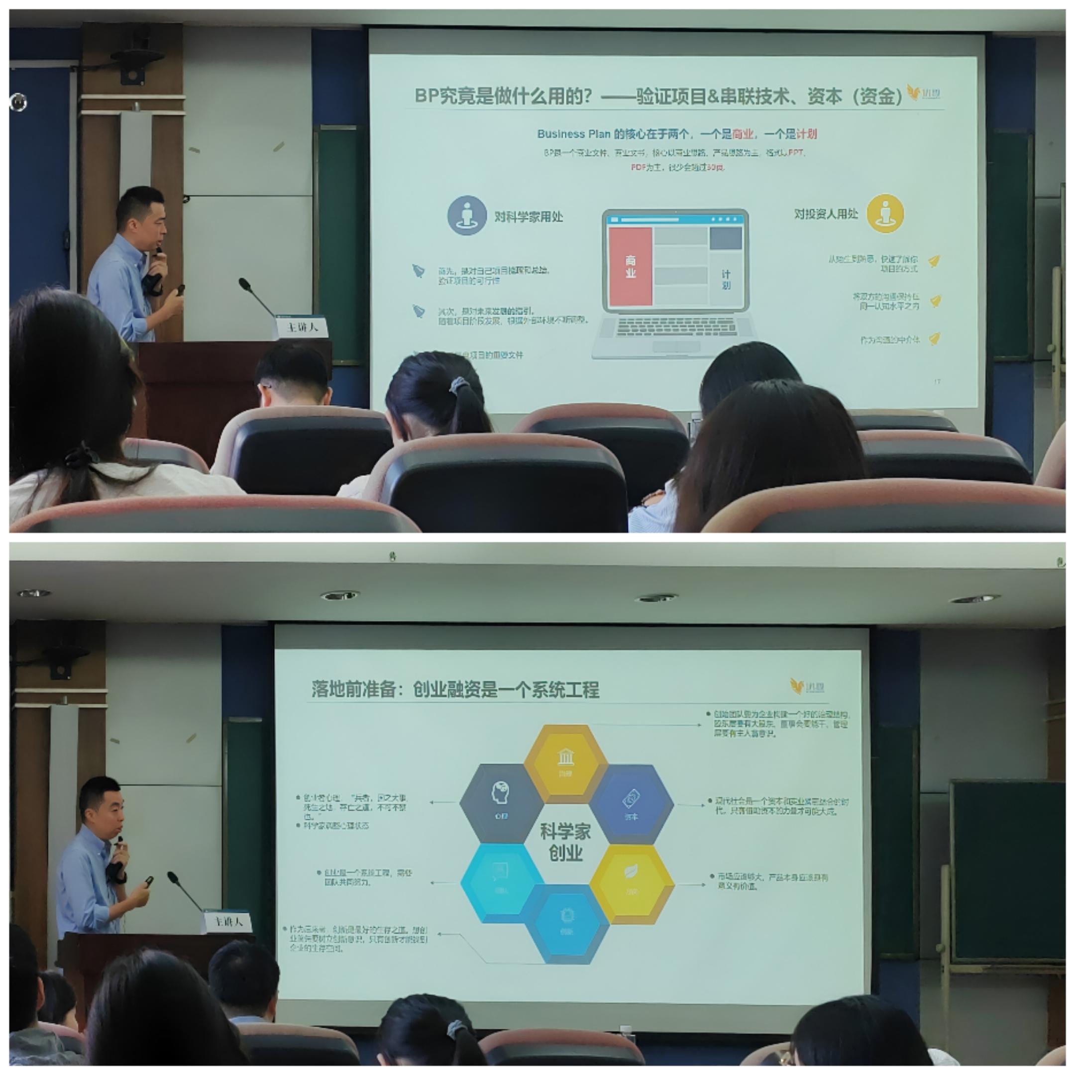在此次讲座活动中,张大为首先带来了一系列商业化验证案例的分享,让在场师生了解了一系列典型的商业模式模型。其次,他围绕商业验证前的准备、如何讲好故事、在途融资上您会遇到哪些坑等问题进行了讲解,他强调,“BP(Business Plan)的核心在于两个,一个是商业,一个是计划,作为一个商业文件、商业文书,BP的核心以商业思路、产品思路为主,格式以PPT以及股权结构案、PDF为主,很少会超过30页”,此外,他从梳理心理、梳理团队、梳理项目等入手,从科学家本身、团队结构、项目本质等角度为实现一个好的创业项目提出了建议。最后,张大为还分享了一系列股权结构案例,通过生动的引导为在场听众开启投融资之门。